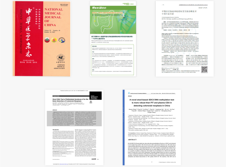 1.The Expert Consensus of Colorecta Cancer Screening Protocol in China (in 2019, Shangshai) 2.Application value of fecal SDC2 gene methylation test in early colorectal tumor diagnosis 3.The Application of Methylation Detection of SDC2 in Diagnosis of Colorectal Cancer 4.The Comparison of Stool DNA and Plasma CEA and CA199 in Detection of Recurrence of CRC after the Surgery 5.The Significance of Combination of Stool DNA Methylation Detection and Colonoscopy in Early Screening of CRC 6.Chinese Experts Consensus on Experimental Diagnosis Of Colorectal Cancer In Precancerous Lesions and Early Stage